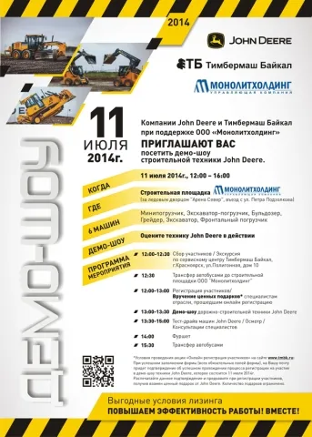 Компании John Deere и Тимбермаш Байкал при поддержке ООО «Монолитхолдинг» приглашают Вас посетить демо-шоу строительной техники John Deere.