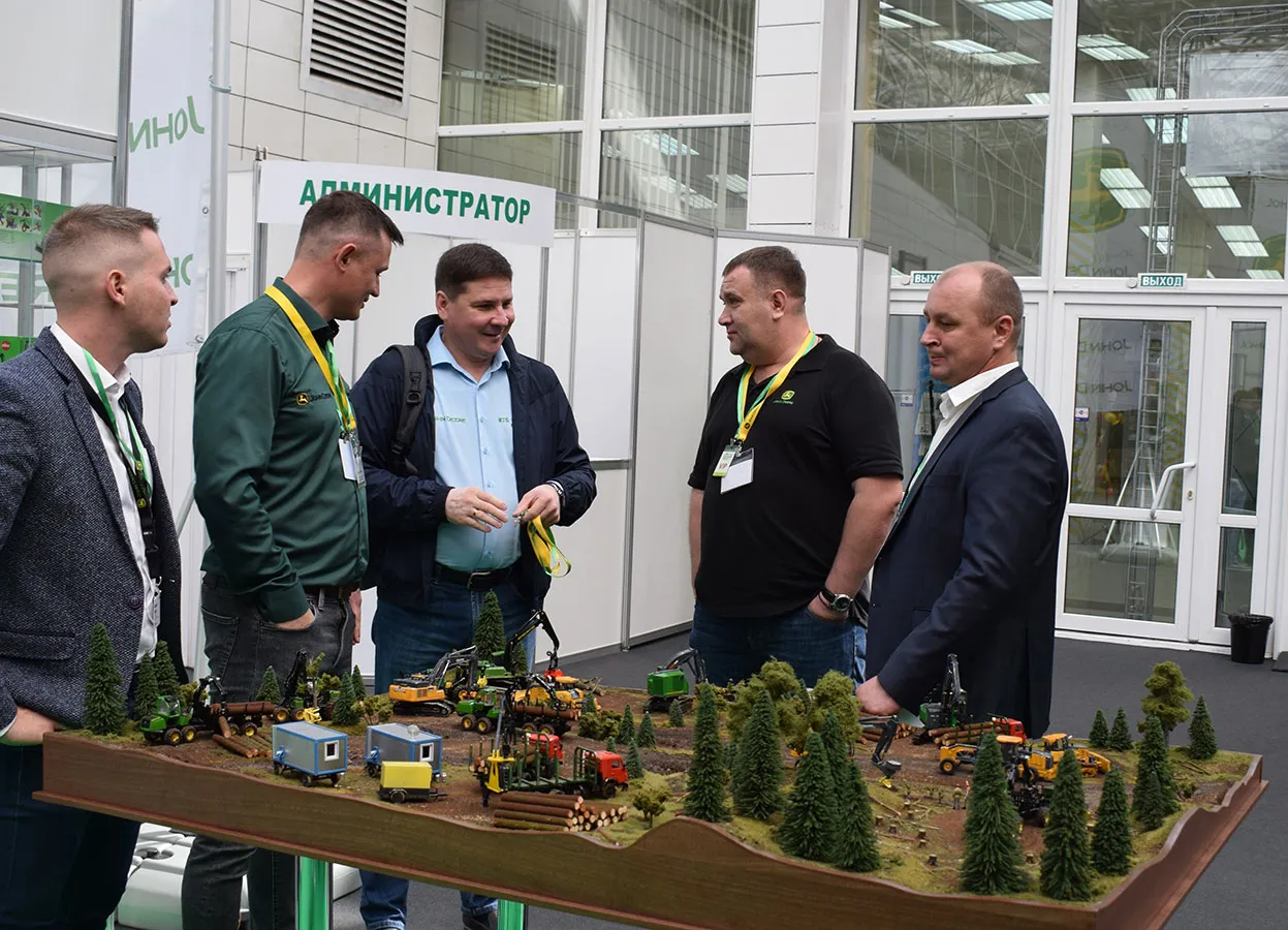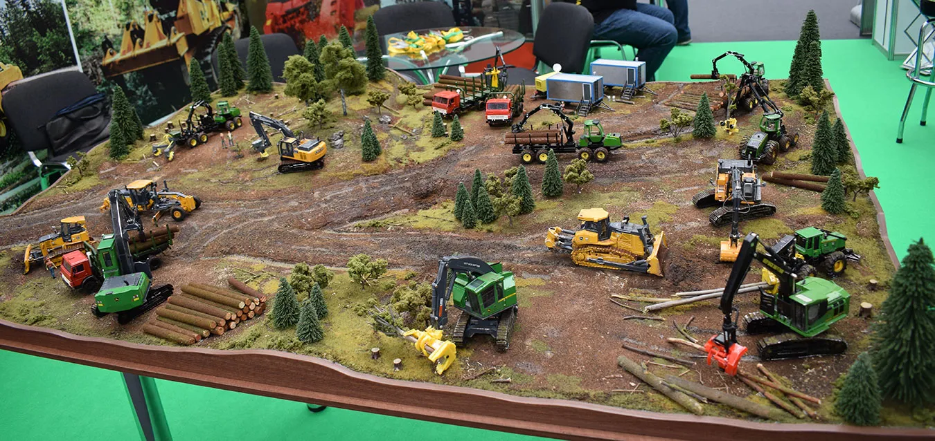 Безусловный интерес гостей мероприятия вызвал макет в масштабе 1:50, на котором мы показали виды работ, которые может выполнять лесозаготовительная и дорожно-строительная техника John Deere, оборудование для лесовосстановления Bracke Forest, погрузочно-разгрузочное оборудование Rotobec.